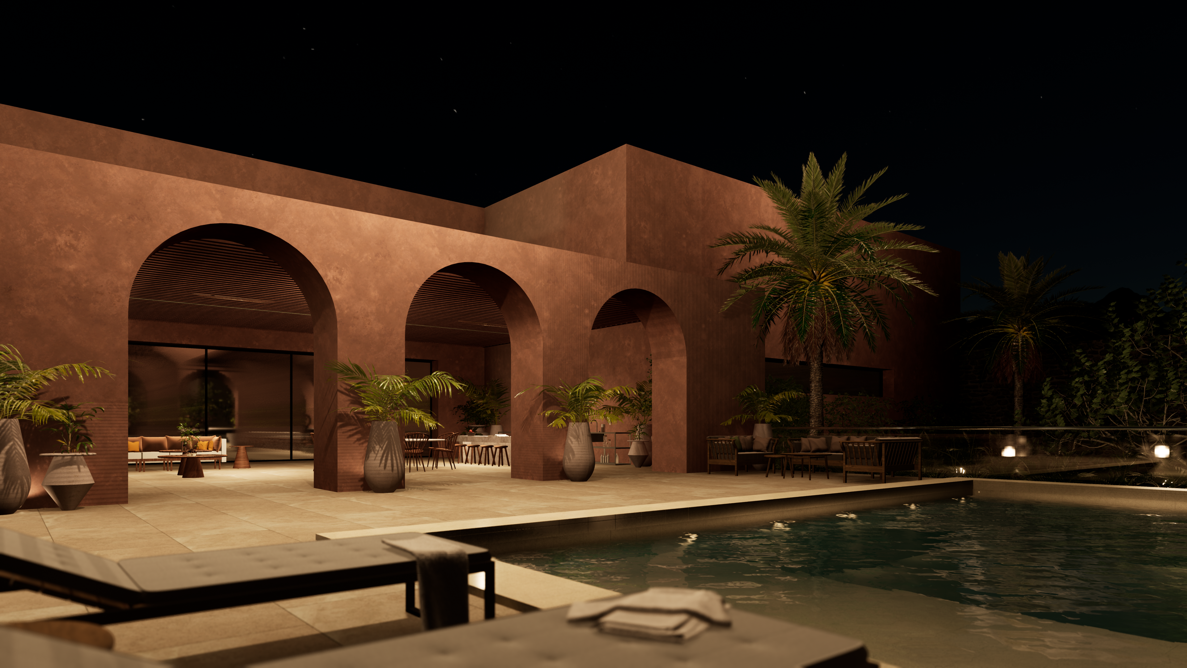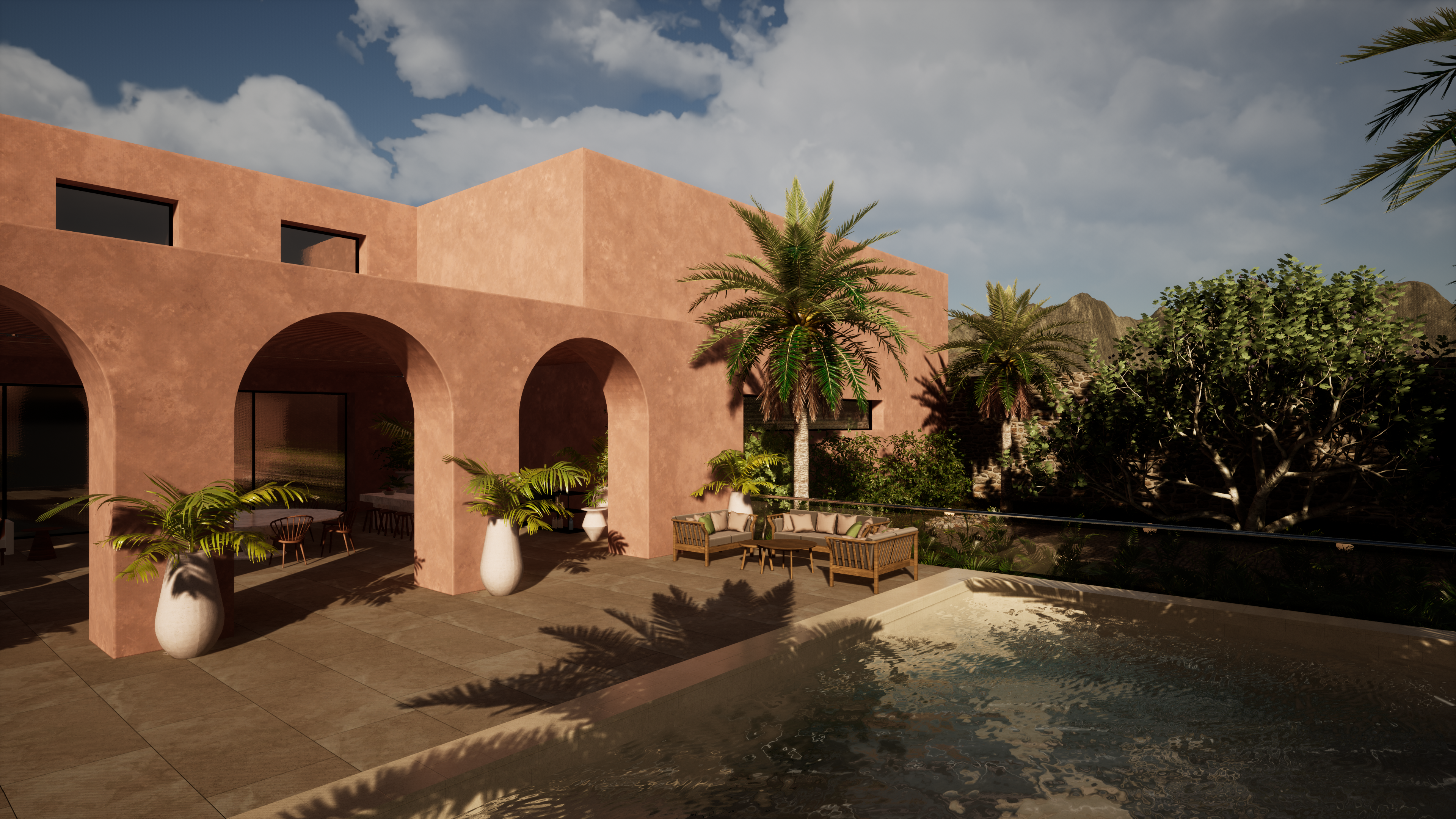 The rocky mountains dominate a very large proportion of the geography of the city of Al Ain, and therefore we have a strong connection to this topography from ancient times, where the use of the natural resources surrounding us and available permanently was the main solution in the urban landscape in the past. The design of the house was inspired by the rocky nature of Jebel Hafeet in Al Ain. The villa is inspired by the location so that it fits with the composition and color of the nature adjacent to it. The Villa has a special roofed outdoor seating, that can be used all year round. This space can also be used as an interior space with simple modification to become an extension of the living room.